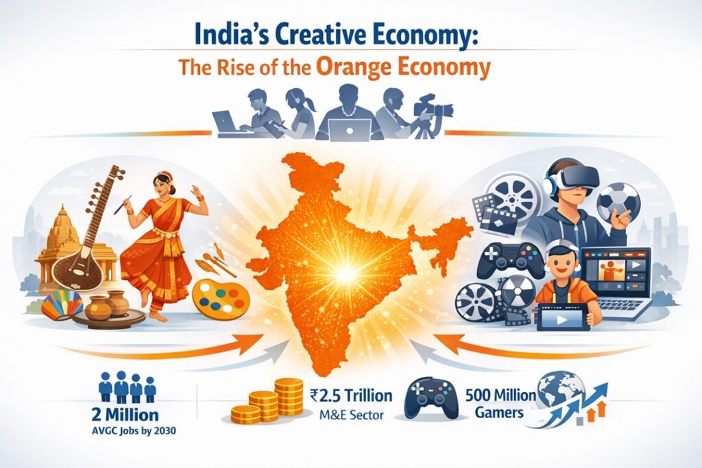 The Orange Economy—a term coined by Iván Duque and Felipe Buitrago—refers to an ecosystem of economic activities where value is primarily generated from creativity, culture, and intellectual property. It bridges traditional cultural expressions (arts, crafts, festivals) with modern digital domains (gaming, VFX, OTT platforms). In the Indian context, it marks a shift where imagination itself becomes a globally tradeable commodity.