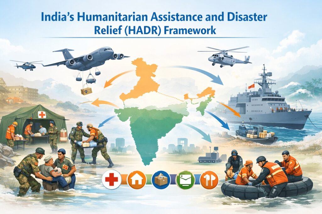 India’s growing engagement in Humanitarian Assistance and Disaster Relief (HADR) highlights its emergence as a dependable crisis responder at the regional and global levels. When civilian capacities are stretched, the Indian Armed Forces are deployed to reinforce disaster response efforts, both within the country and abroad.