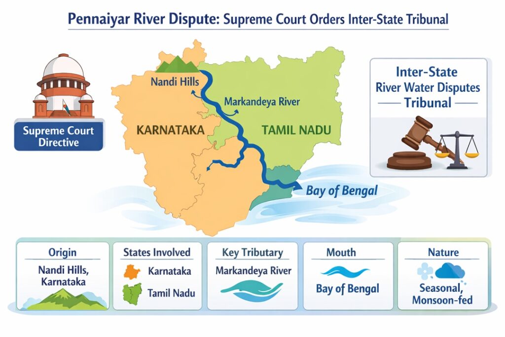 The Supreme Court of India has instructed the Union Government to set up an Inter-State River Water Disputes Tribunal within a month to address the long-pending Pennaiyar river water conflict between Tamil Nadu and Karnataka.